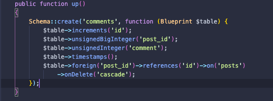 ファイル __create_comment_table にcommentと post_idカラムを追加する。