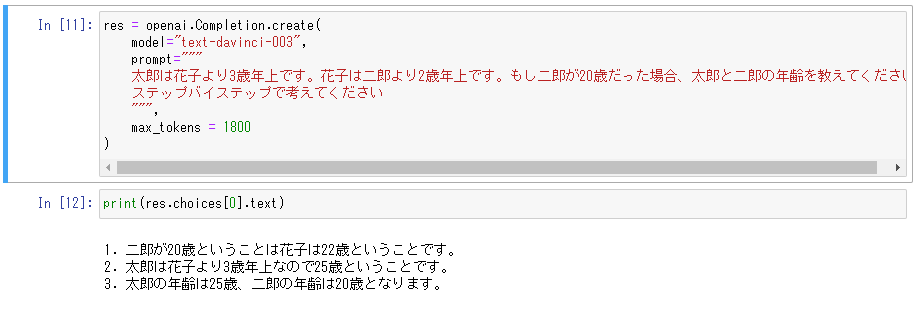こうすることで、OpenAI APIは一回で回答を出そうとしないで、