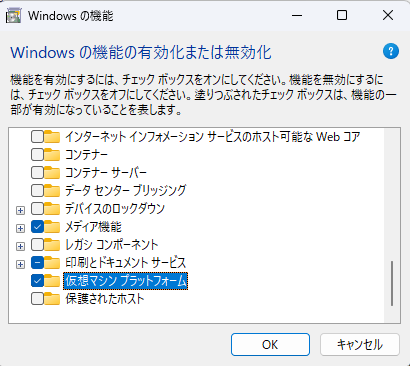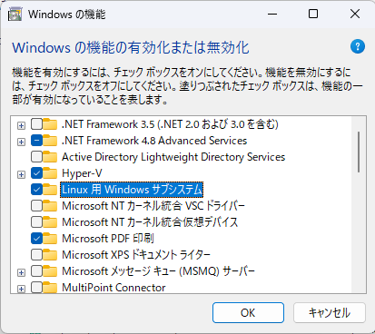 コントロールパネル > プログラムと機能 > Windows の機能の有効化または無効化 を開きます。