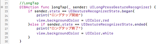 UIGestureRecognizerStateにて、ジェスチャーの状態を知る事ができ、それを用いて判定しています。beganはロングタップの開始、endedで終了時の処理を振り分けてみました。